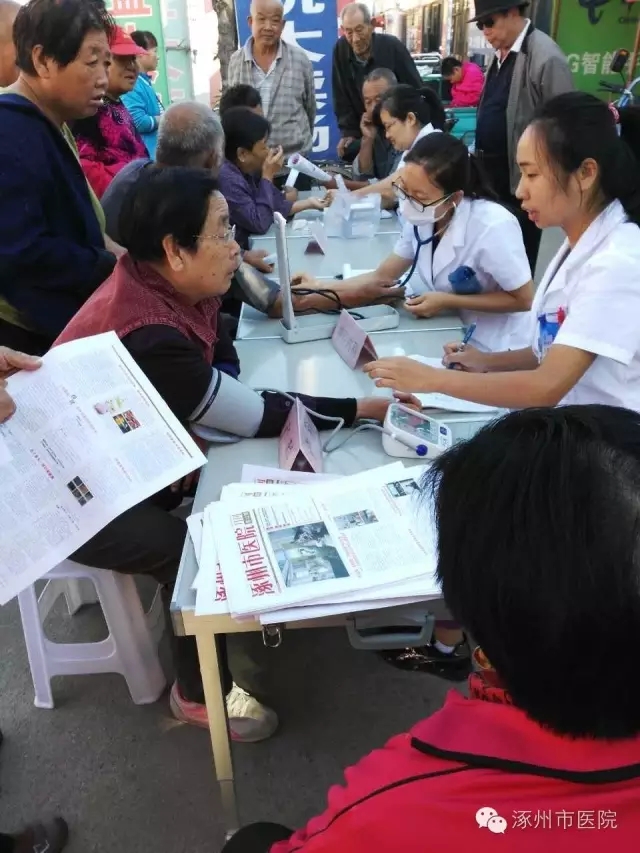 在涿州市医院市场部主任张建奎的带领下,心内科,神内科,肿瘤科,综合治疗科,肿瘤科,内分泌科,高压氧科等科室派出医生参加,进行高血压,心脏病,糖尿病,常见病和慢性病的咨询,初步筛查,诊断和一般治疗,普及医学常识和健康常识,同时发放医院院刊及各科室宣传资料。