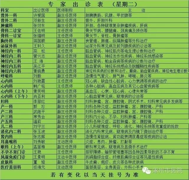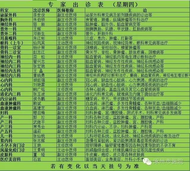 2016年11月14日-11月20日专家出诊表