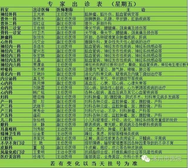 2016年10月31日-11月6日专家出诊表